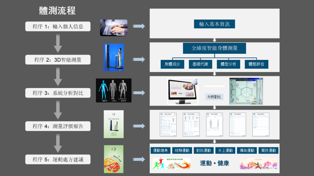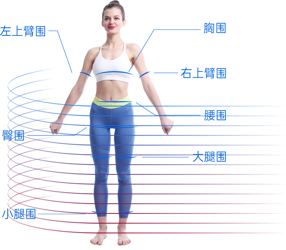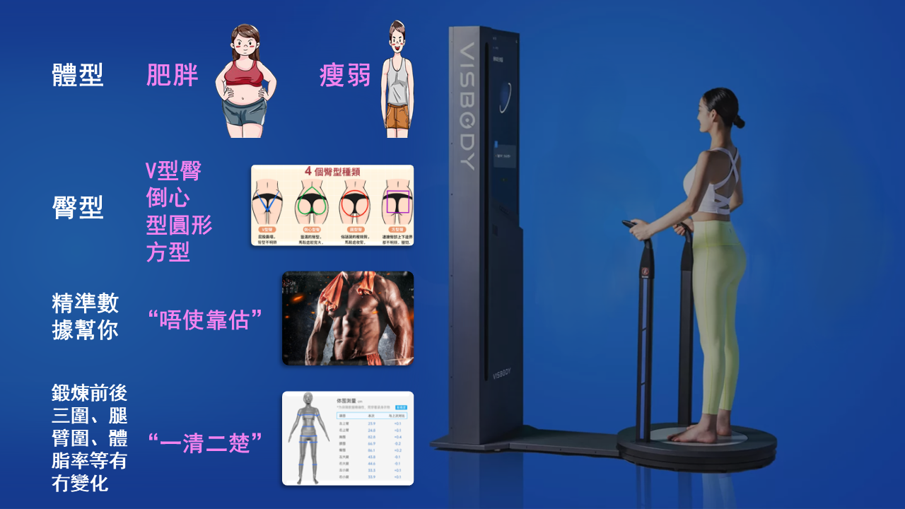 “智能體測”是一項先進、快速、安全的身體測量技術,結合3D掃描與人工智能,精確捕捉人體各項數據,包括圍度、長度、寬度、體脂率、肌肉量等18項身體成分指標,10項體態評估和9項體圍(腰圍、胸圍、臀圍、大小腿圍及臂圍)數據,並生成詳細的身體機能數據分析,體型、體態和3D人體圖型精確報告。
