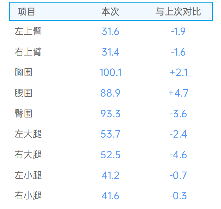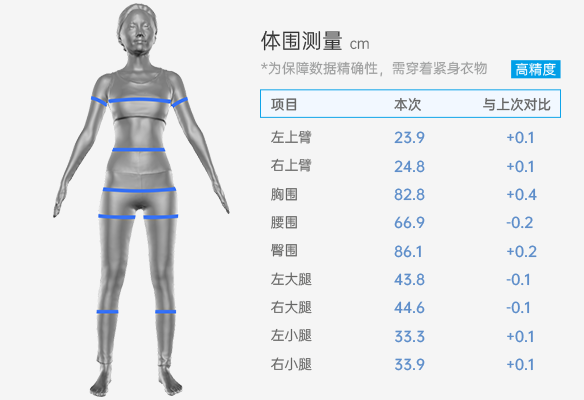 項目包括:身體成分、脂肪肌肉、肥胖分析(體脂率、BMI、腰臀比))、基礎代謝、身體9個維度、內臟脂肪,細胞內外液、曆史趨勢對比,體型、體態評估,肩、頸活動范圍評估等精准測量胸圍、腰圍、臀圍、臂圍、大小腿圍。